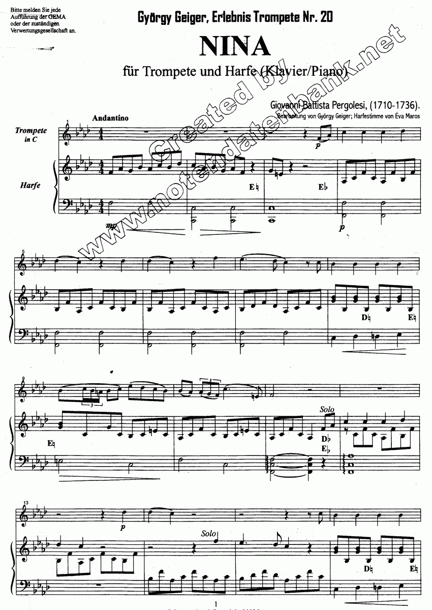 Instrumentation / informations Trp (trompette en si bémol); Hrp / Pno