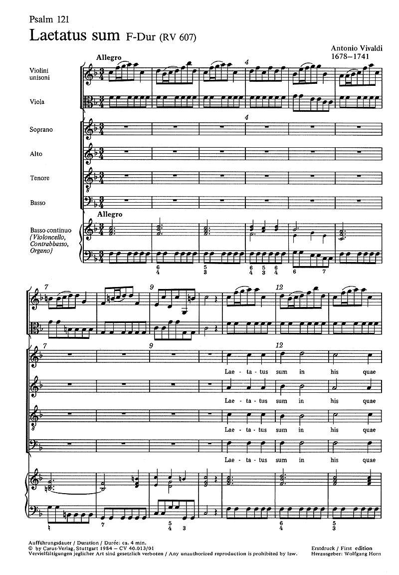 Informations complémentaires/contenu Die hier im Erstdruck vorgelegte Komposition des 121. Vulgata-Psalms, der in der römischen Liturgie vor dem II. Vaticanum Bestandtteil der Vesper am Festtag einer Jungfrau, namentlich der Jungfrau Maria, war, gehört zu den einfachsten der erhaltenen Psalmvertonungen Antonio Vivaldis.