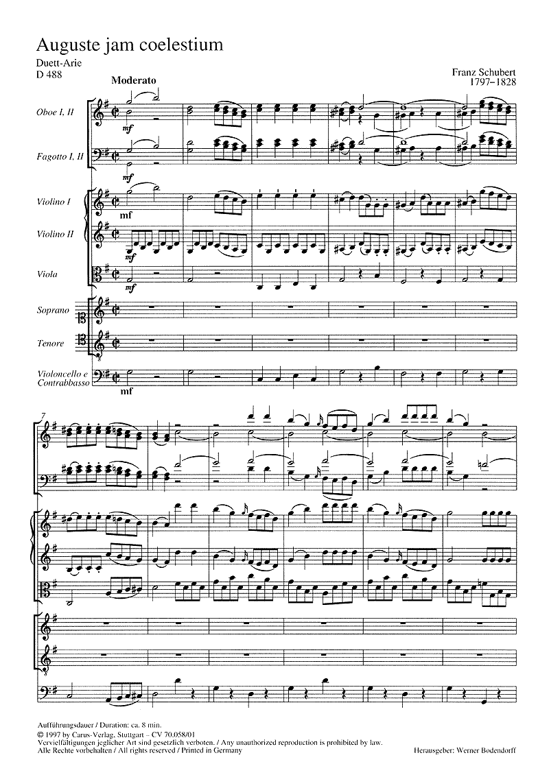 Auguste jam coelestium - cliquer ici Auguste jam coelestium (VoSoST; 2 hautbois; 2 bassons; 2 violons; alto; Vcl; Concertband), partition