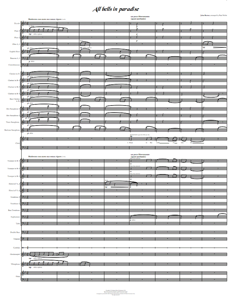 "All bells in paradise" was written for the 2012 Festival of Nine Lessons and Carols held each Christmas Eve at King's College. For this, John Rutter turned to a carol text more or less contemporary with King's Chapel itself, the 15th century Corpus Christi Carol, to which he added his own text. This arrangement is written for combined Concert Band and Chorus, but may be performed by Band alone. Bands will find this arrangement very accessible in its technical demands. Its beauty and simplicity will add to music for the Christmas season.