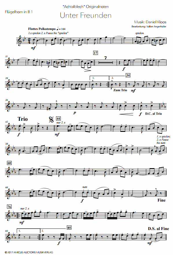Informations complémentaires/contenu Die neue Polka von Daniel Kloos knüpft an den Erfolg der SMS-Polka an und besticht durch schwungvolle, reich synkopierte Melodielinien, mit originellen Gegenmelodien. Gewidmet ist sie der Gruppe Achtalblech, welcher der Komponist als Trompeter angehört. Dem juvenilen Alter der Widmungsträger entspricht das herzhaft frische Tempo dieser originellen Polka in böhmischem Stil.