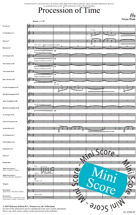 Informations complémentaires/contenu Procession of Time (Procession du temps) a été composée pour commémorer le 120e anniversaire de la fondation du lycée Kokura Nishi, situé à Fukuoka, au Japon. La pièce commence par une introduction dramatique plus lente. La mélodie simple mais impressionnante est répétée sous plusieurs formes tout au long de la pièce. Cette composition émotionnelle et énergique sera un excellent choix pour tous les concerts et concours.