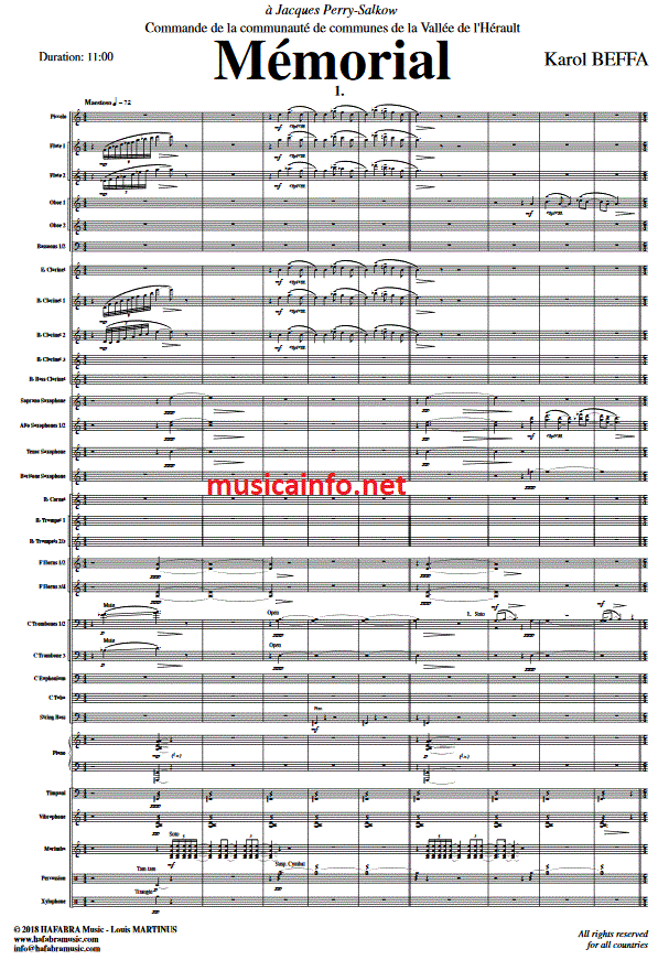 Informations complémentaires/contenu Commandé par une communauté de communes de la Vallée de l'Hérault, le Mémorial pour orchestre d'harmonie a été créé les 9, 10 et 11 novembre 2018 dans le cadre de la célébration de la fin de la Première Guerre mondiale. Chaque mouvement peut être joué séparément.