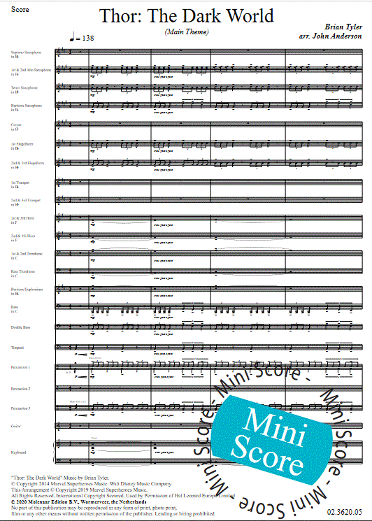 Informations complémentaires/contenu "Thor : The Dark World" est la bande originale du film du même nom de Marvel Studios. Composée par Brian Tyler, la bande sonore est sortie en numérique en 2013 chez Hollywood Records. Cet arrangement de John Anderson s'adapte parfaitement aux orchestres d'instruments à vent de toutes sortes.
