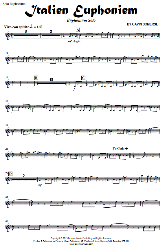 Informations complémentaires/contenu Occasionally, a solo comes along that allows the performer to show off their skill, whilst allowing the band a licence to enjoy themselves too. From the pen of Gavin Somerset comes a solo that takes all the 'bravissimo' of the great Italian composers and delivers a piece that both the audience and performers can enjoy. This original work is written with tongue placed firmly in cheek in this playful, light-hearted take on Italian music with a built in fun factor. The work is a must for both Euphonium soloists and bands looking to add a playful item to their programme