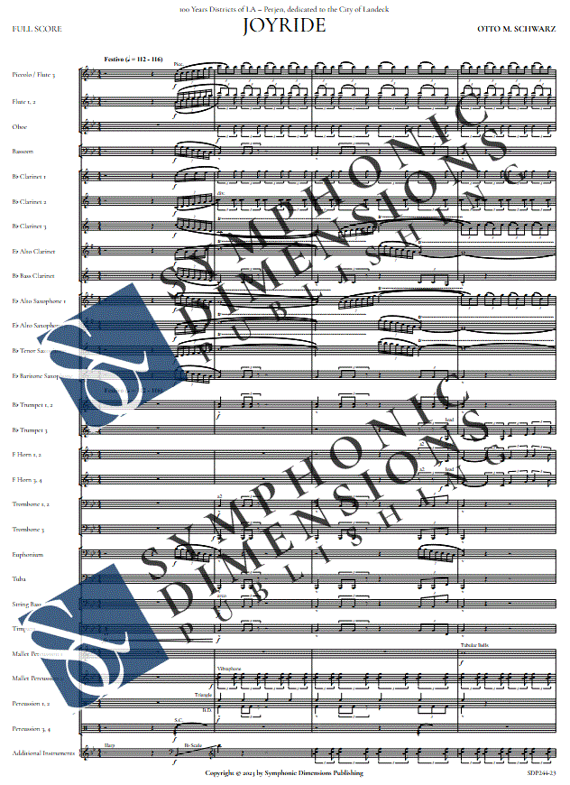 Informations complémentaires/contenu « Joyride » a été commandée par la ville de Landeck, en Autriche, pour incarner l'optimisme, le développement florissant et un avenir prometteur. Elle dépeint non seulement le progrès économique, mais aussi la richesse culturelle d'une ville moderne et futuriste. L'œuvre s'ouvre sur une fanfare majestueuse qui se prolonge harmonieusement par un joyeux Allegro en 7/8. Une section en accélération constante est suivie d'un passage central calme qui plonge l'œuvre dans une atmosphère contemplative. La réexposition rassemble les motifs initiaux sous une forme variée. « Joyride » offre à tous les groupes instrumentaux l'occasion de développer leur maîtrise du langage musical caractéristique du compositeur.