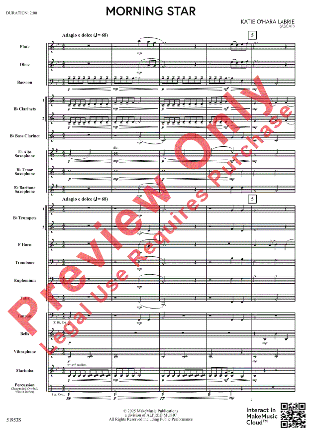 Informations complémentaires/contenu Cette réflexion musicale invite l'auditeur à prendre un instant chaque jour pour apprécier la beauté qui nous entoure. « Morning Star » de Katie O'Hara LaBrie met en valeur des mélodies fluides qui s'enchaînent avec grâce d'une section à l'autre, tandis que de riches harmonies offrent une assise chaleureuse. Des percussions abondantes y ajoutent une touche d'éclat qui ne manquera pas de faire briller les étoiles.