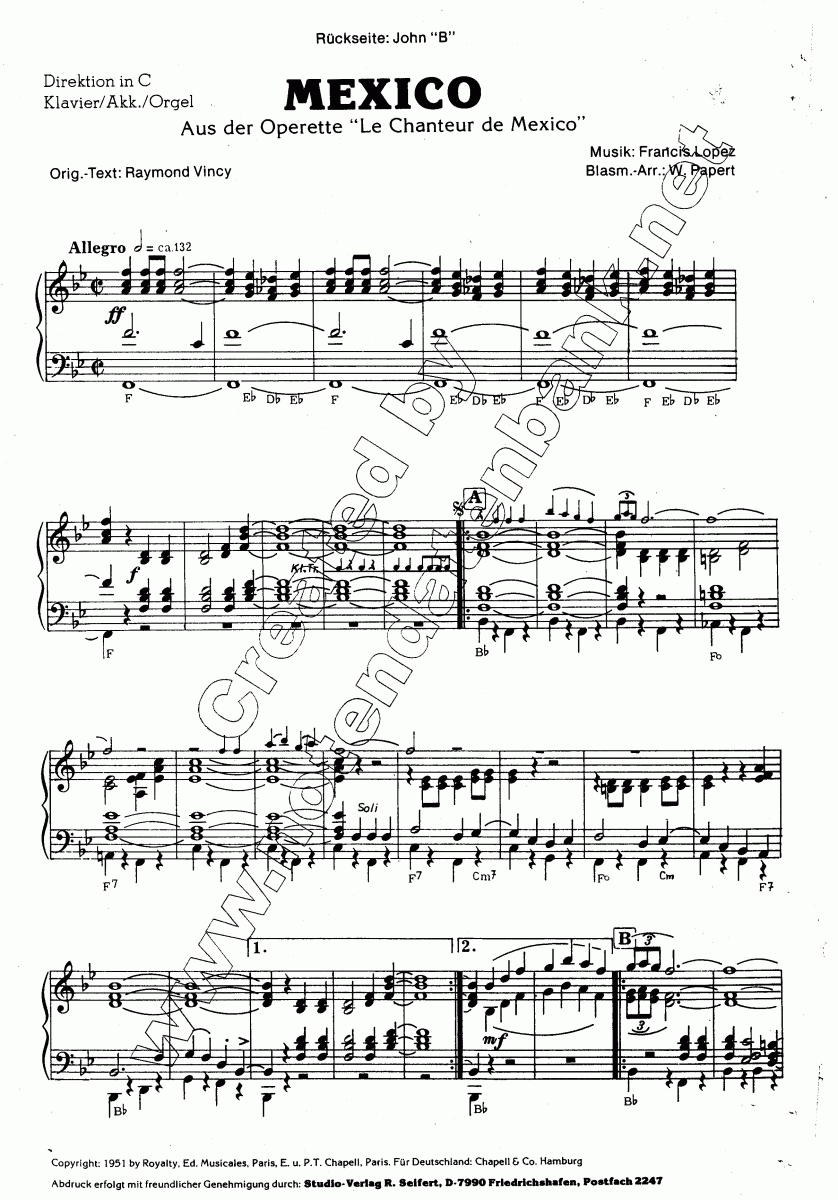 Mexico (aus der Operette 'Le Chanteur de Mexico') - cliquer ici Mexico (aus der Operette 'Le Chanteur de Mexico') (orchestre d'harmonie), Score condensé et parties